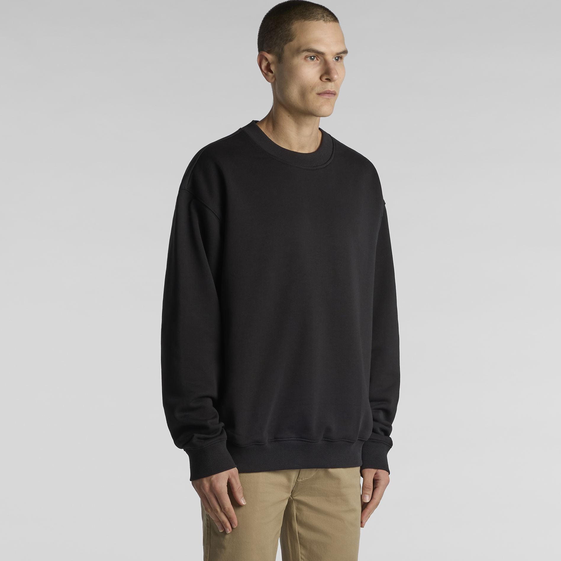 Construction: Pullover crew, drop shoulder, inset sleeves, neck, hem and sleeve 2x2 ribbing, french terry, preshrunk to minimise shrinkage
